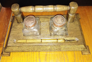 Penny Topped Inkstand. Handcrafted oak base with two antique/vintage glass ink bottles with manufacturers details. Slight crack in one bottle but no leaks, Handmade copper lids with inset Victorian pennies. Handmade wooden shaft dip pen. One of a kind. £28.00 plus p&p. |