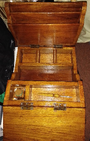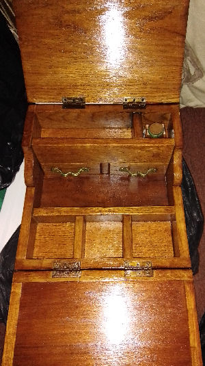 Oak 'Desk in a box' Writing Slope and Stationary Storage combined all folds down into a large box. Made from recycled wood, antique/vintage glass inkwell with new wooden top, dip pen, two small drawers with vintge brass handles, storage section for paper or documents, compartments for small stationary items. Lid of box folds forward to form a writing slope (pic 1). Amazing item for the avid writer. £175.00 collection only from Sheffield as very bulky and heavy. |